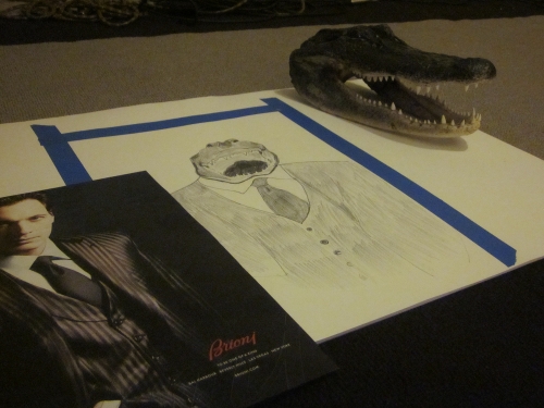 Second shot is the setup, including, yes a taxidermized alligator head that my drawing teacher has. A little strange, but surprisingly effective. (and easier than a live gator)